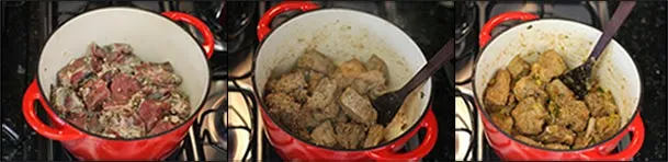 Depois que todos os ingredientes estiverem bem refogados, adicione mais 100ml de vinho, coloque a tampa na panela e leve-a ao forno pré aquecido. Deixe a carne cozinhando por duas horas, retire-a de vez em quando e adicione um pouco de água quente se a carne estiver sem líquidos, cuidando para não queimar.