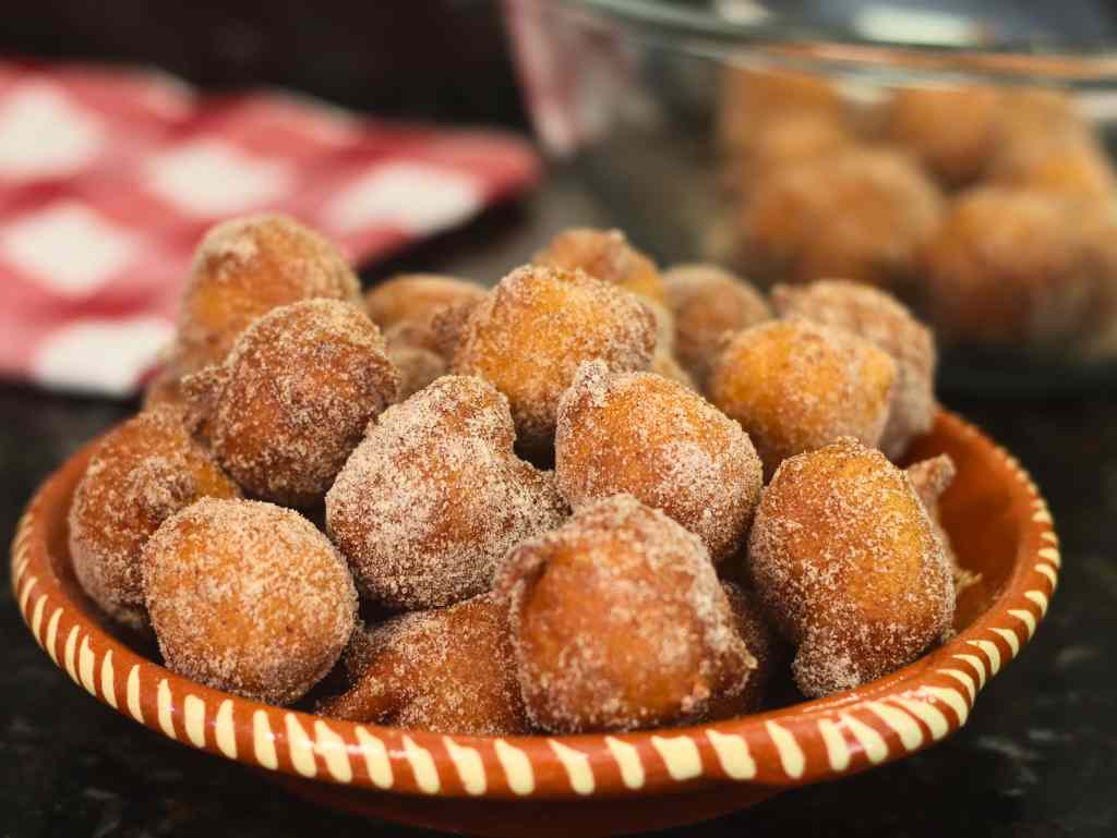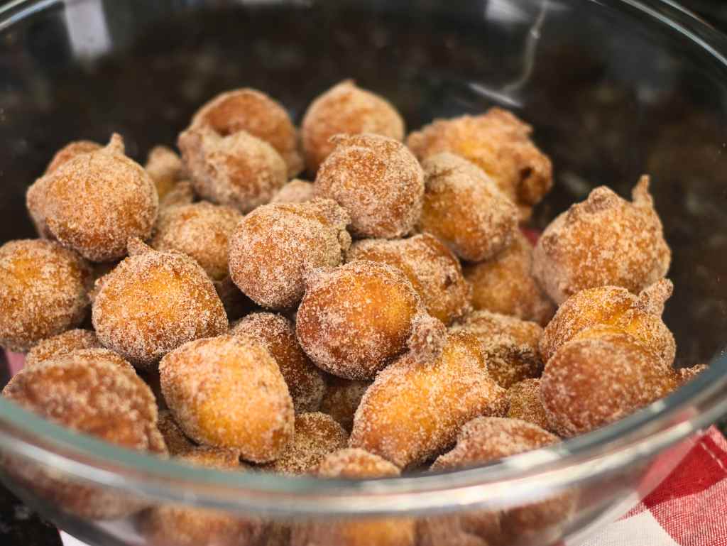 - Depois passe seus bolinhos por uma mistura de açúcar com canela.