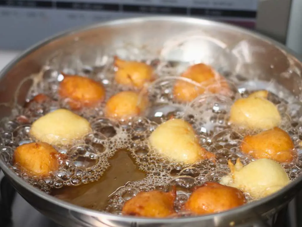 - Temperatura ideal do óleo: O óleo deve estar a 180°. Faça o teste colocando um pouquinho de massa, se ela subir imediatamente, borbulhando, já deve estar na temperatura correta.