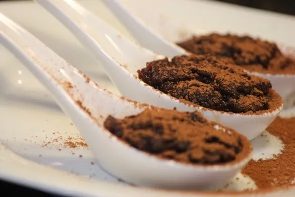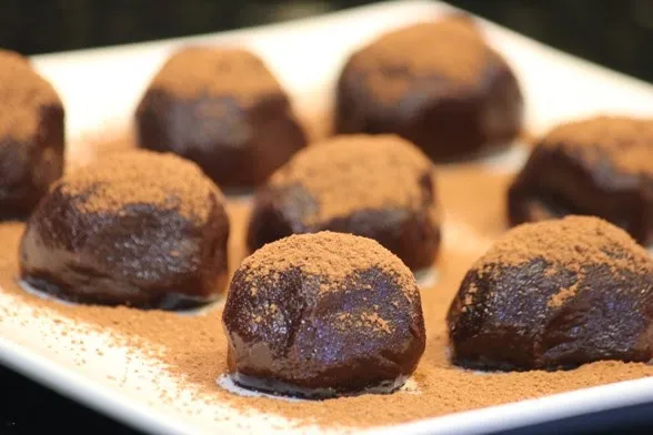 Assim que o purê estiver morno, adicione o chocolate derretido e reserve até que a mistura esteja totalmente fria, em seguida modelo os docinhos e acomode em um prato ou forminhas e polvilhe cacau.