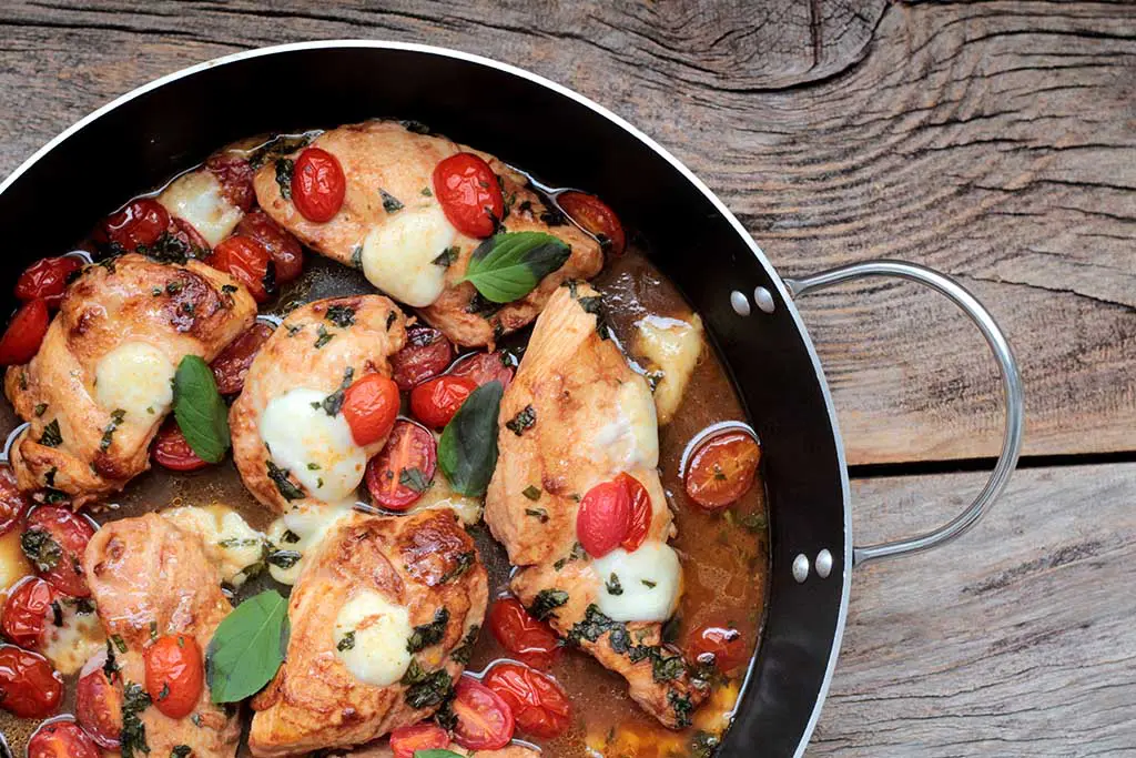 Peito de frango com tomate-cereja e mussarela de búfala